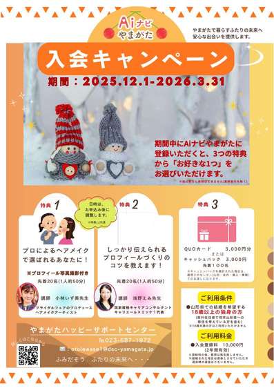 令和7年12月1日から令和8年3月31日までの間にやまがたハッピーサポートセンターのマッチングシステム『Aiナビやまがた』に登録していただくと特典がついてくる入会キャンペーンを行っております。