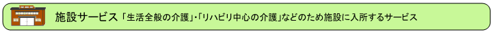 | 短所入所(ショートステイ) | 介護老人福祉施設など短期入所ができる施設に短期間入所します。食事や入浴、排せつなどの日常生活上の支援や機能訓練などを受けます。 |