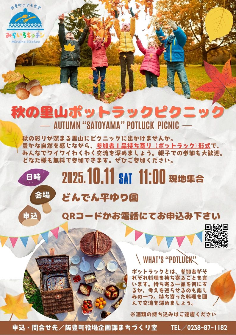 秋の彩りが深まる里山にピクニックに出かけませんか。 豊かな自然を感じながら、参加者1品持ち寄り(ポットラック)形式で、みんなでワイワイわくわく交流を深めましょう。親子での参加も大歓迎です。